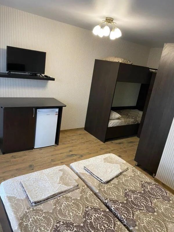 тумбочки, шкаф, двухэтажная кровать, кровать двуспальная, журнальный столик, вешалка, балкон, посуда